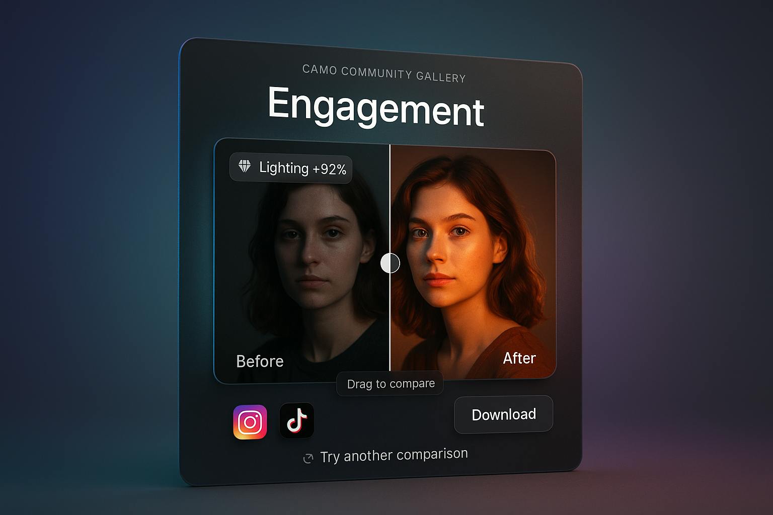 This frontend prototype simulates a premium before/after experience — where users can upload, compare, and share visual enhancements made with Camo Studio.
